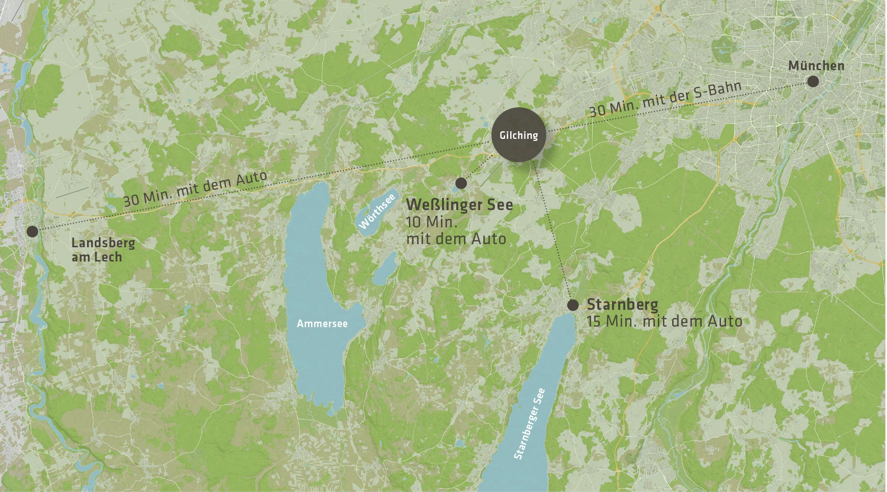 Unweit von München – etwa 20 Km in Richtung Berge – liegt die Gemeinde Gilching. Mit knapp 19.000 Einwohnern gehört sie zum Landkreis Starnberg. Perfekt angebunden an München, dazu schön gelegen in der Nähe von fünf idyllischen Seen, zeigt sich Gilching als perfekter Standort mit idealer Infrastruktur.